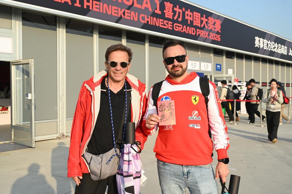 2026年3月13日,上赛场外,来自澳大利亚的伊万(右)与他的父亲托尼拿到了车迷礼品,他迫不及待打开了袋子,拿到一张印着“一马当先”的红纸。澎湃新闻记者 吴栋 图