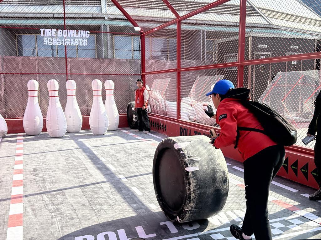 2026年3月11日,上海西岸的格子旗嘉年华设置了多项趣味游戏。图为一名女士正在体验轮胎保龄球。澎湃新闻 实习生 杨溜 图